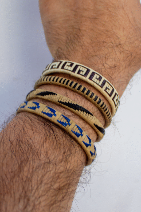 Tejidas a mano por artesanos de la comunidad indígena Wounaan, estos brazaletes destacan por sus patrones audaces y su presencia imponente. Cada diseño es una expresión del legado cultural del Pacífico colombiano, que se transmite con orgullo a través del arte tejido.