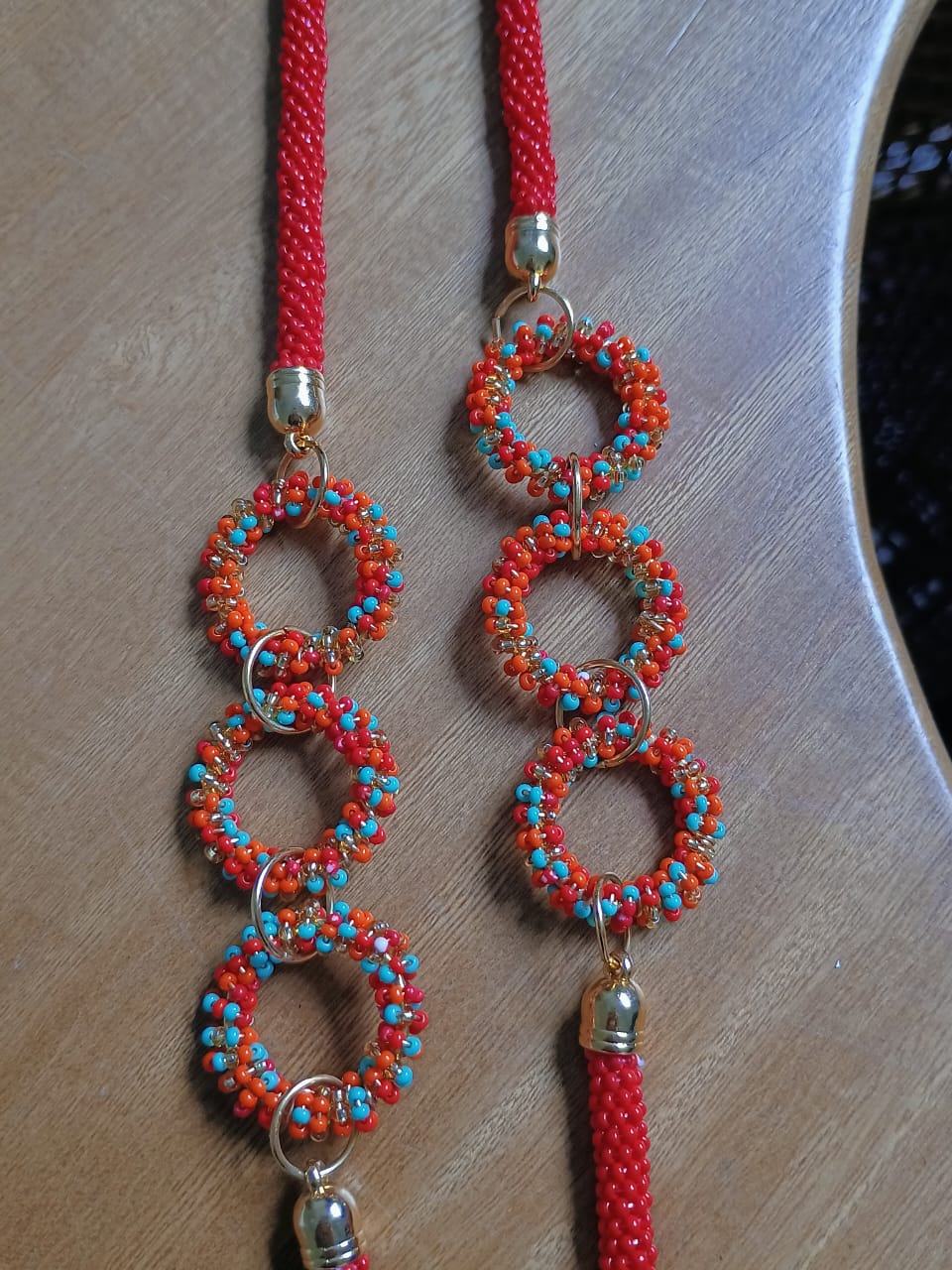 Joyas contemporáneas que combinan la tejeduría tradicional en chaquira y murano con láminas de bronce y baño en oro. Una pieza única que destaca por su variedad de colores y por la meticulosidad de su entramado artesanal, evocando la alegría y la vitalidad de nuestro país.