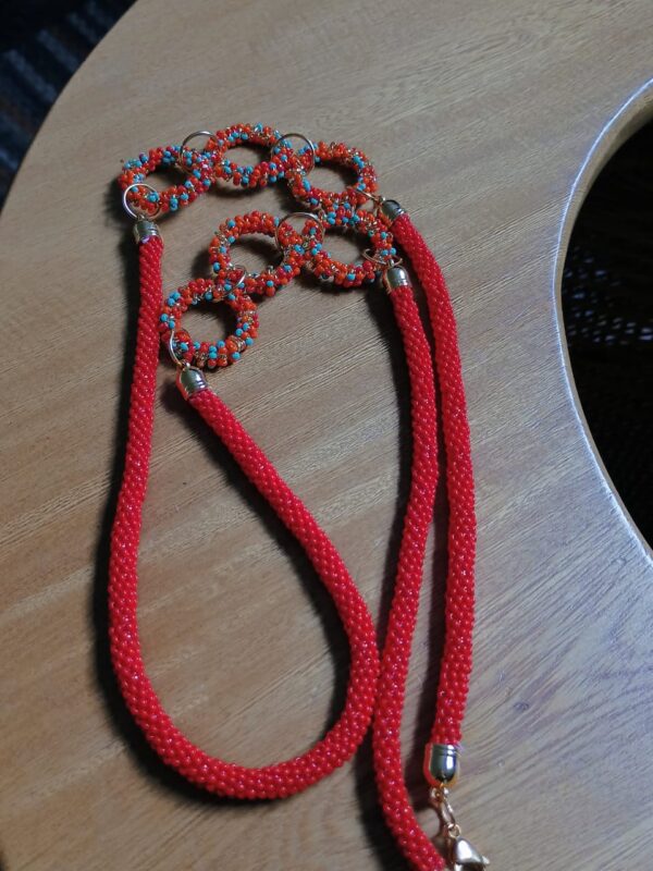 Elaborado por Ana María y un grupo de mujeres tejedoras, este collar representa la fuerza creativa y la tradición artesanal colombiana. El diseño circular refleja la unidad, la comunidad y la magia de la creación manual, donde cada piedra de murano y cada chaquira revela la habilidad de manos que tejen historias y dan vida a una joya única.