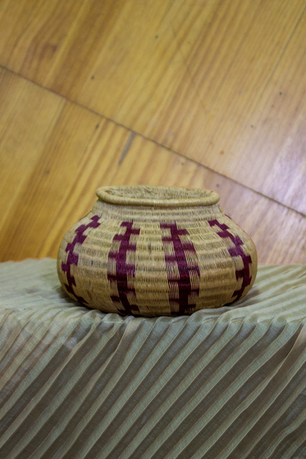Tejido a mano con fibra de palma de werregue por el artesano Wounaan Cerapio, este jarrón honra la tradición de los antiguos cántaros usados para transportar el agua. Sus formas y líneas circulares evocan la relación espiritual con el río, fuente de vida y sabiduría para su comunidad.