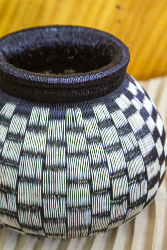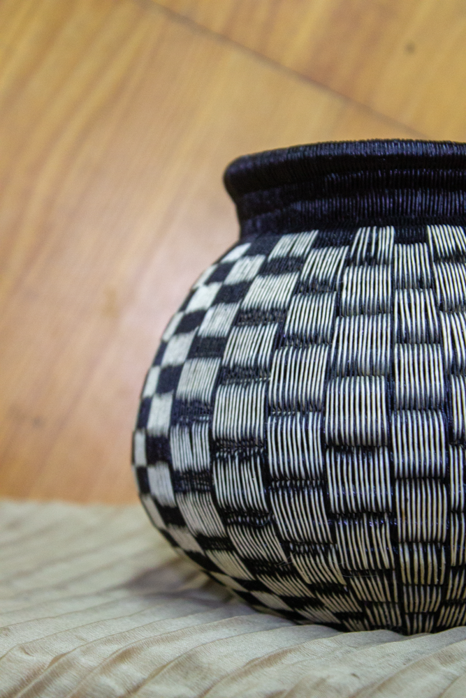 Creado por Wilmar Cuero, líder de taller artesanal de la etnia Wounaan, originario del Litoral de San Juan, Chocó, este jarrón representa la preservación de técnicas ancestrales. Wilmar trabaja con fibras naturales, promoviendo la identidad cultural y el arte tradicional del Pacífico colombiano.