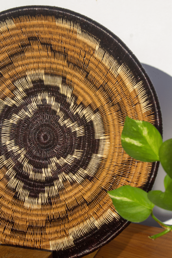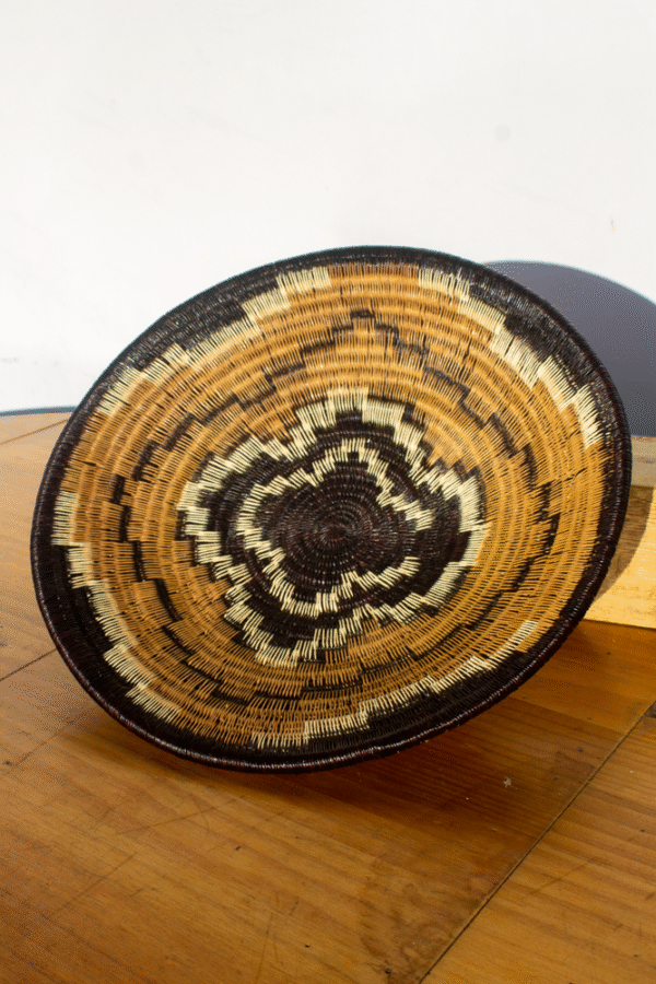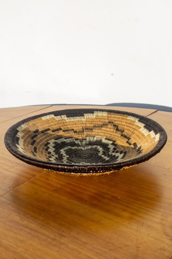Tejido a mano con fibra de palma de werregue por el artesano Wounaan Cerapio, este platón honra la tradición de los antiguos cántaros usados para transportar el agua. Sus formas y líneas circulares evocan la relación espiritual con el río, fuente de vida y sabiduría para su comunidad.