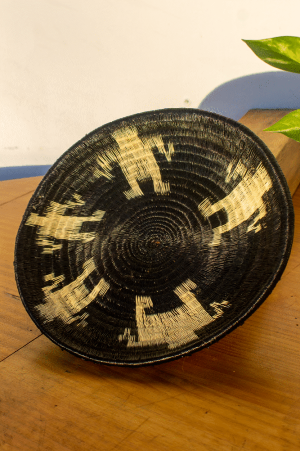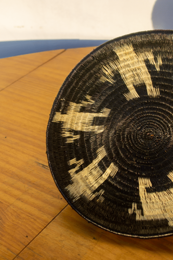 La palma de werregue, fibra emblemática del tejido Wounaan, ha sido utilizada por generaciones para crear piezas utilitarias y simbólicas. En este diseño circular, los patrones gráficos expresan el flujo del agua y los ciclos de la vida, recordándonos la importancia de cuidar lo esencial.