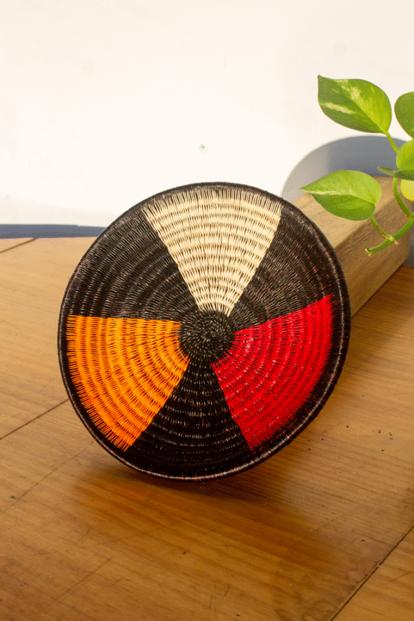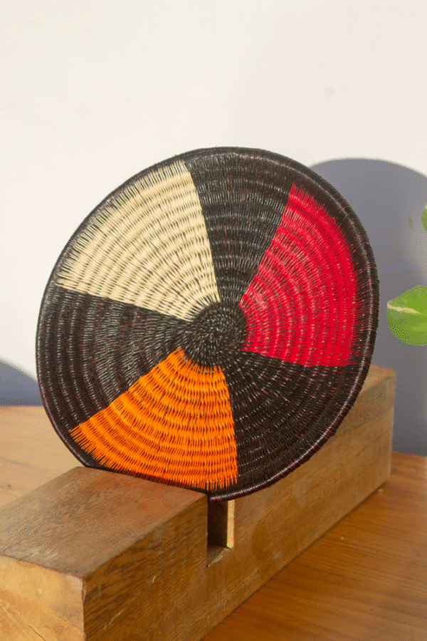 La palma de werregue, fibra emblemática del tejido Wounaan, ha sido utilizada por generaciones para crear piezas utilitarias y simbólicas. En este diseño circular, los patrones gráficos expresan el flujo del agua y los ciclos de la vida, recordándonos la importancia de cuidar lo esencial.