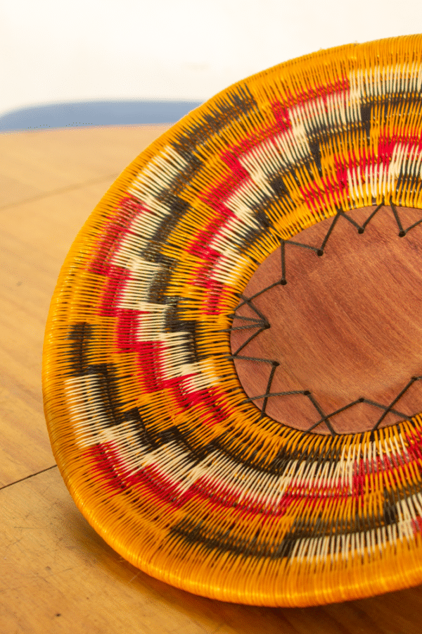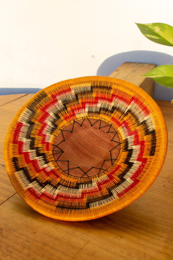 La palma de werregue, fibra emblemática del tejido Wounaan, ha sido utilizada por generaciones para crear piezas utilitarias y simbólicas. En este diseño circular, los patrones gráficos expresan el flujo del agua y los ciclos de la vida, recordándonos la importancia de cuidar lo esencial.