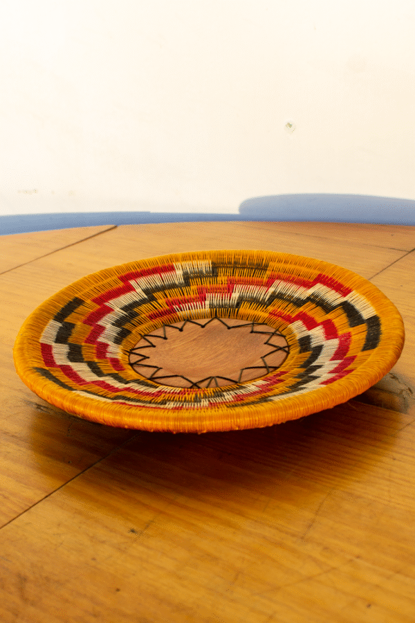 Tejido a mano con fibra de palma de werregue por el artesano Wounaan Cerapio, este platón honra la tradición de los antiguos cántaros usados para transportar el agua. Sus formas y líneas circulares evocan la relación espiritual con el río, fuente de vida y sabiduría para su comunidad.