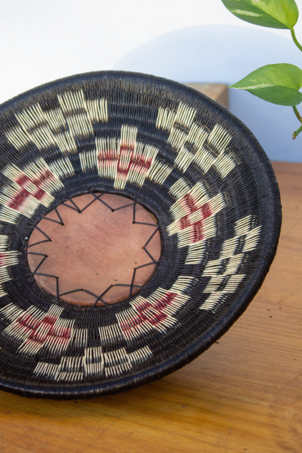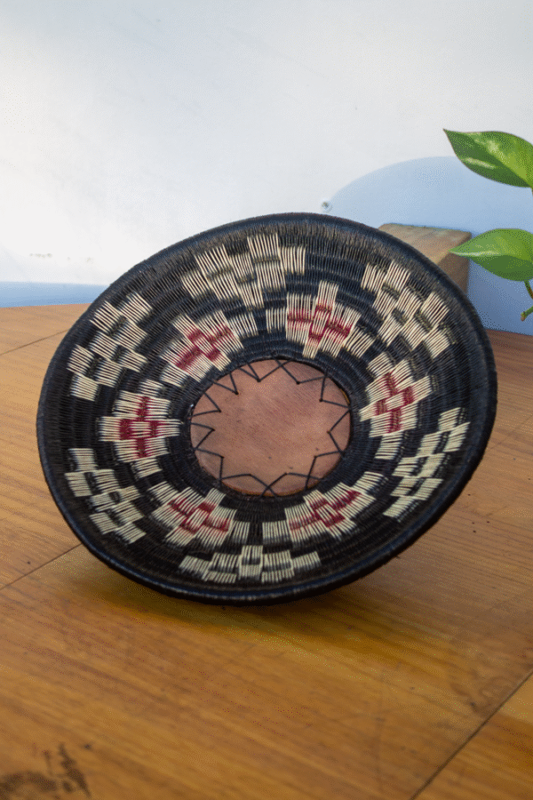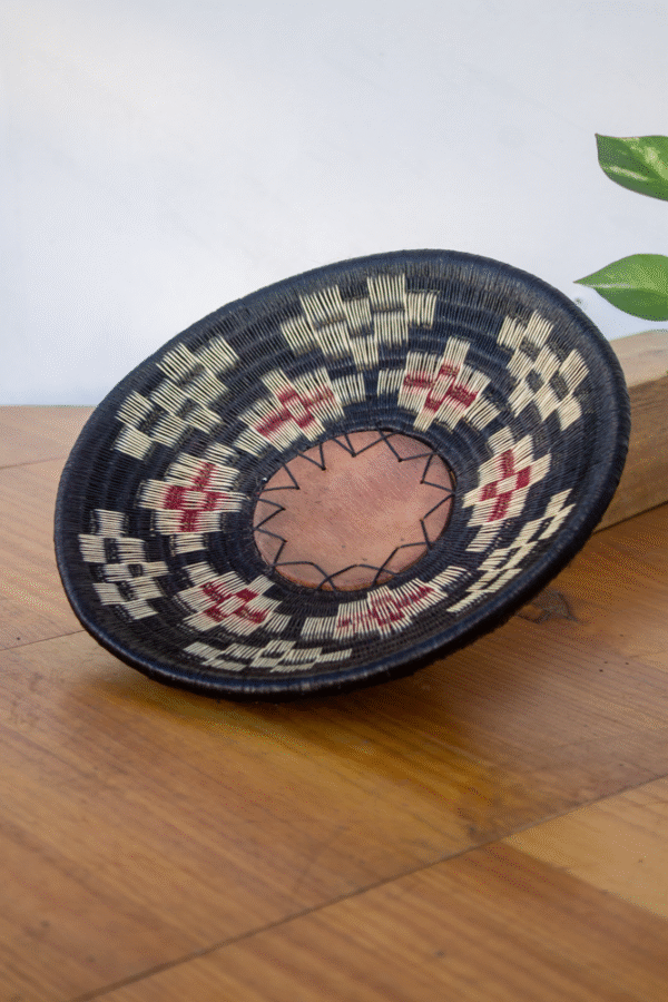 La palma de werregue, fibra emblemática del tejido Wounaan, ha sido utilizada por generaciones para crear piezas utilitarias y simbólicas. En este diseño circular, los patrones gráficos expresan el flujo del agua y los ciclos de la vida, recordándonos la importancia de cuidar lo esencial.