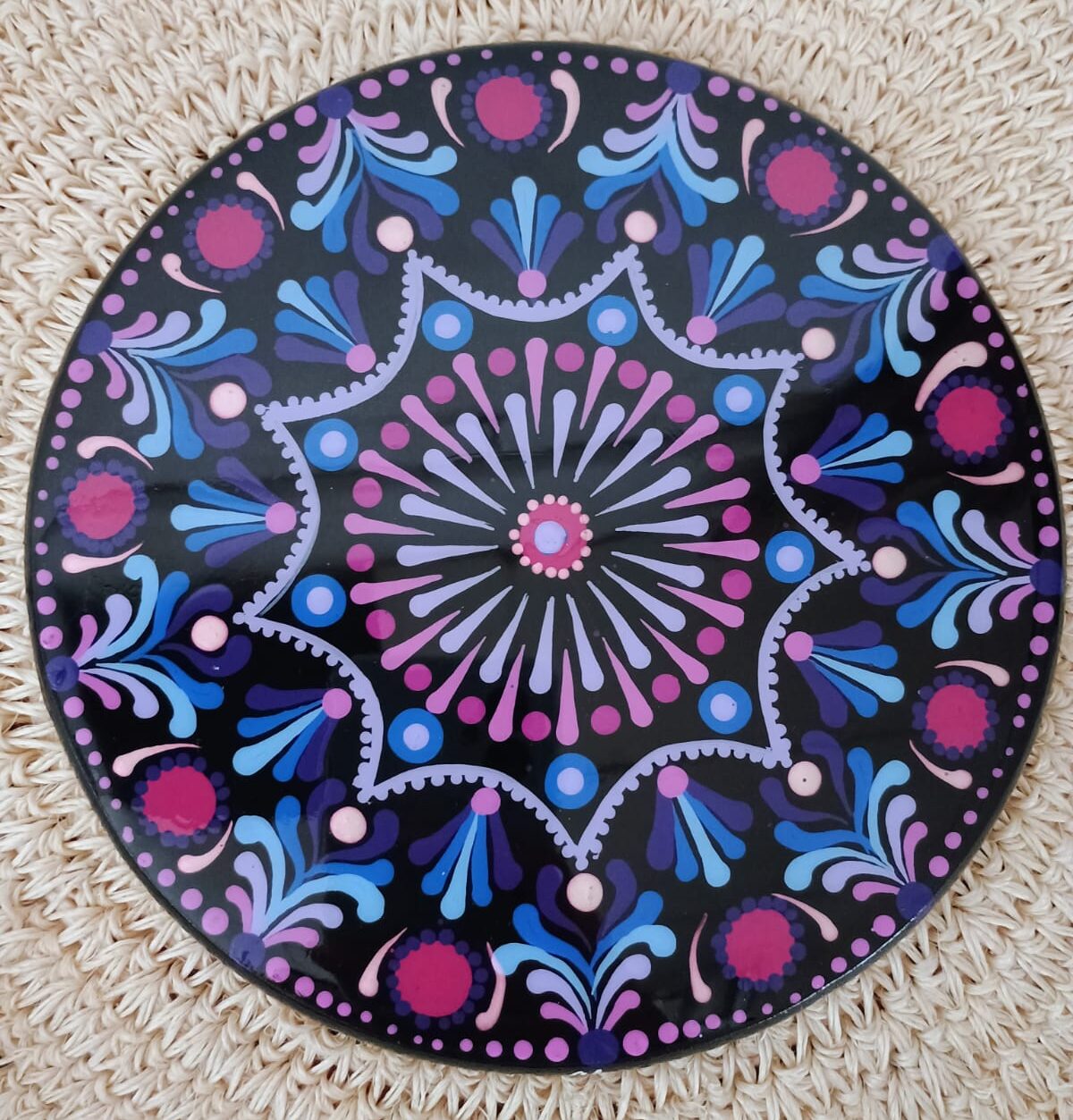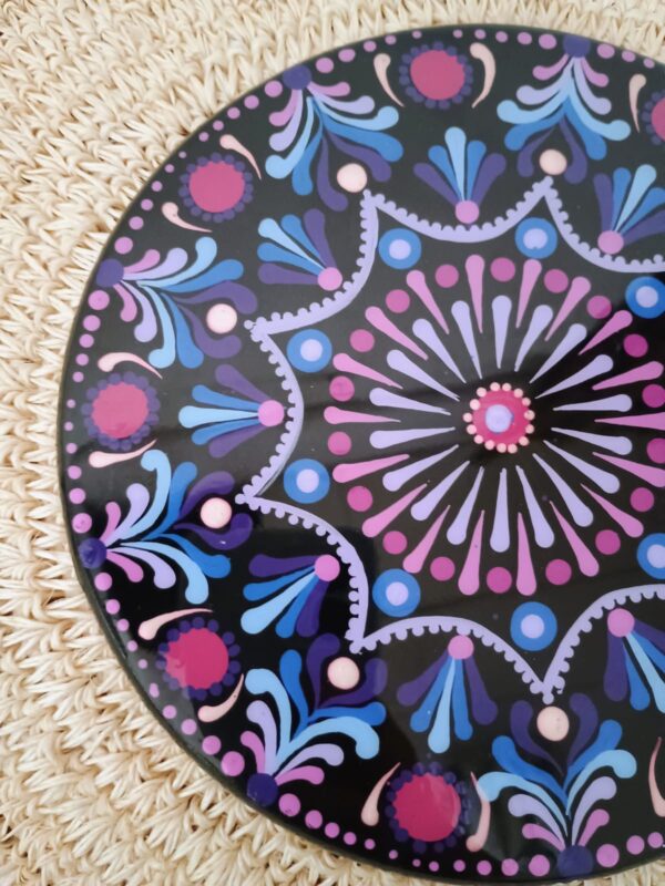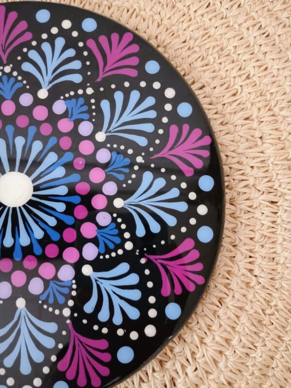 🔸 Descubre el portacaliente Mandala 18 CM – Violeta con Azul pintado por Claudia Hincapié y apoya el trabajo artesanal que embellece los detalles de tu día a día.