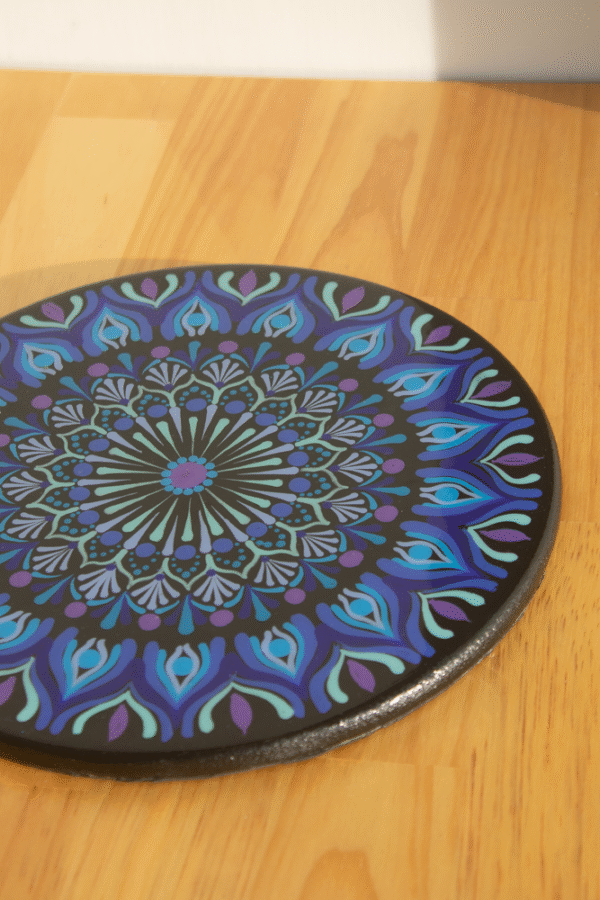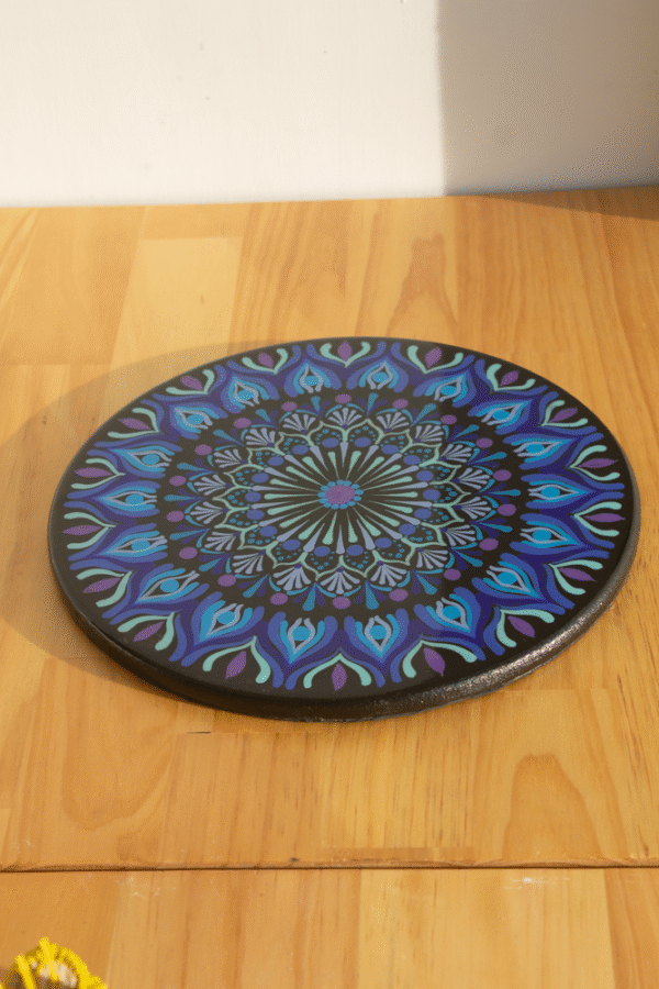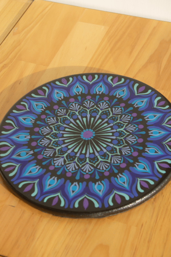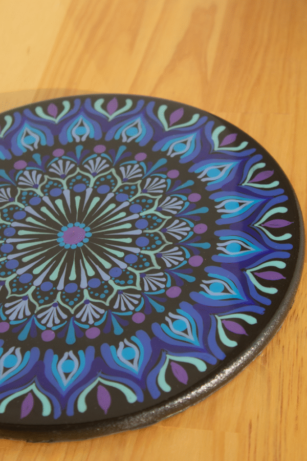 🔸 Descubre el portacaliente Mandala 25 CM – Azulado pintado por Claudia Hincapié y apoya el trabajo artesanal que embellece cada rincón de tu día a día.