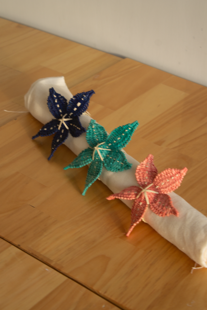 Tejido a mano por Juanita Castillo, artesana campesina de Sandoná, Nariño, este servilletero combina la tradición de la cestería en fibra de iraca con la inspiración del mundo marino. Su diseño de estrellas de mar representa la armonía entre la tierra y el océano, recordándonos la belleza de los paisajes naturales de Colombia.