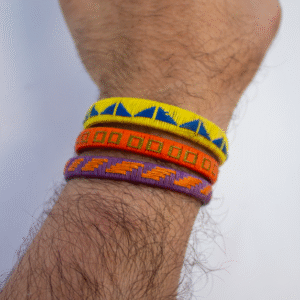 Brazaletes tejidos en palma de Werregue – Variaciones en color Amarillo/Naranja/Lila.